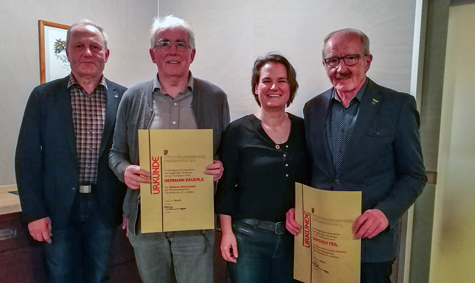 Im Gegenzug „revanchierte“ sich Feil bei Bäuerle und überreichte diesem die WTB-Vereinsehrennadel in Silber für die 30jährige Vereinsarbeit als 1. Vorsitzender. Beide haben in ihrem gemeinsamen Schaffen maßgeblich die Weiterentwicklung des TCs vorangetrieben – unter anderem durch den Bau eines Vereinsheims.